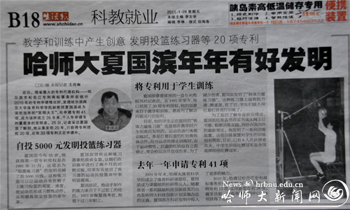 1月28日《生活报》B18版以《哈师大夏国滨年年有好发明》为题报道了我校体科院教师夏国滨副教授的发明事迹。