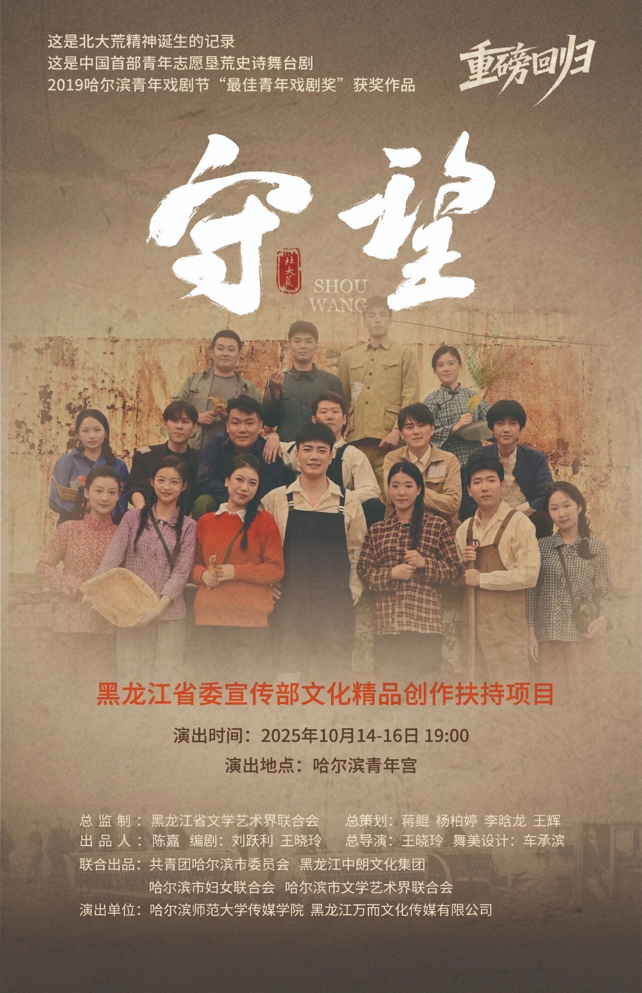 由黑龙江省文学艺术界联合会监制,拼搏在线登录传媒学院和黑龙江万而文化传媒有限公司联袂呈现,共青团哈尔滨市委员会、黑龙江中朗文化集团、哈尔滨市妇女联合会、哈尔滨市文学艺术界联合会共同出品的中国首部青年志愿垦荒史诗舞台剧《守望》在哈尔滨青年宫成功演出。这部匠心之作,以戏剧之美完成了一场跨越时空的精神对话,谱写了一曲荡气回肠的青春赞歌。作品以1955年至1958年间中国黑龙江省萝北县为背景,生动再现了来自北京、...