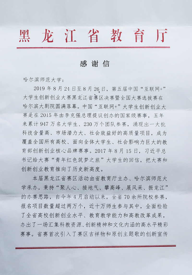 (盛志伟/文)近日,我校喜获黑龙江省“互联网+”大学生创新创业大赛组委会发来的感谢信,致谢我校对黑龙江省“互联网+”大学生创新创业大赛及创新创业工作的协助与支持,并希望继续携手奋进,共谋发展,深入贯彻落实...