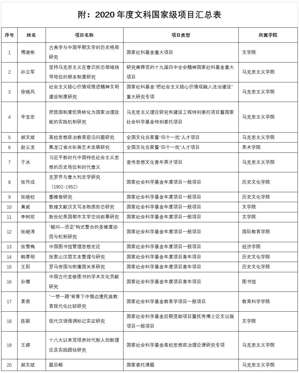 日前,我校2020年度文科国家级科研项目再获重大突破,获批文科国家级科研项目20项。