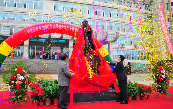 图 孔子铜像揭牌现场 9月12日,我校在江北校区图书馆门前举行了孔子铜像揭幕仪式,该铜像由香港孔教学院院长、世界儒商联合会会长、国际儒学联合会副会长、爱国儒商汤恩佳先生向我校捐赠。