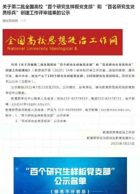 (刘岩冬/文)7月23日,教育部思想政治工作司发布了《关于第二批全国高校“百个研究生样板党支部”和“百名研究生党员标兵”创建工作评审结果的公示》通知,经过组织推荐、通讯评审、集中会审,遴选产生了100个研究生...
