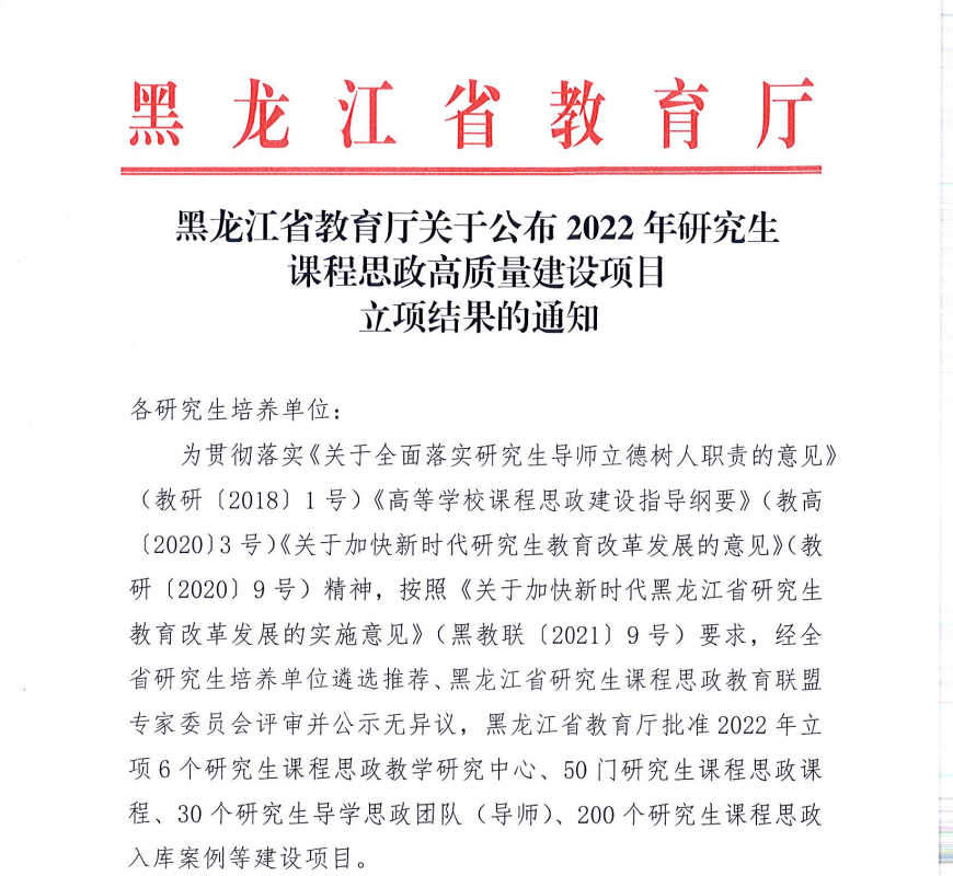 (孟威/文)日前,黑龙江省学位委员会和省教育厅公布了2022年黑龙江省研究生课程思政高质量建设项目评审结果,我校有17个项目获批立项,其中研究生课程思政教学研究中心建设项目1个、研究生课程思政课程建设项目3个、...