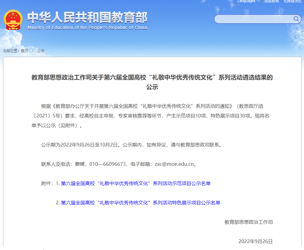 近日,第六届全国高校“礼敬中华优秀传统文化”系列活动遴选结果公示。