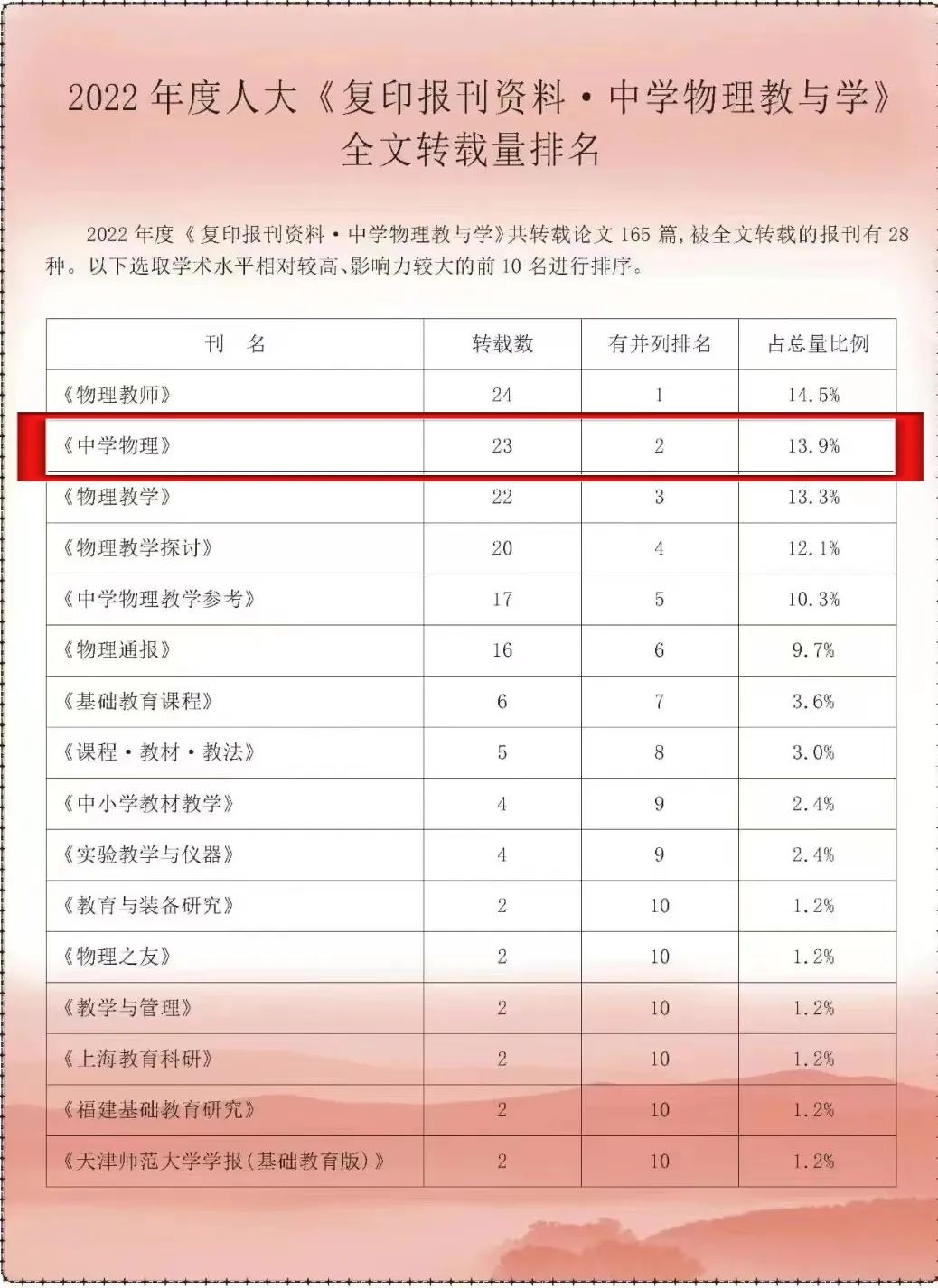 (孙宝东/文)近日,中国人民大学书报资料中心发布了2022年度人大复印报刊资料《中学物理教与学》全文转载量排名数据,我校主管主办的《中学物理》期刊被全文转载23篇/165篇,占总量13.9%,超过核心期刊《物理教学》,...