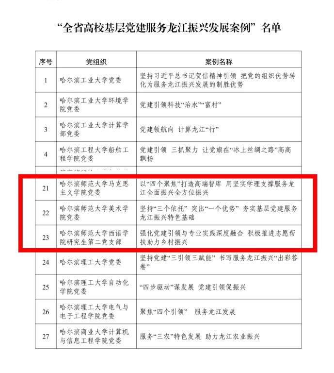 近日,黑龙江省委教育工委公布了全省高校基层党建服务龙江振兴发展案例评选结果,经过组织申报、专家评审,我校美术学院党委《坚持“三个依托” 突出“一个优势” 夯实基层党建服务龙江振兴特色基础》工作案例、马克思主义学院党委《以“四个聚焦”打造高端智库 用坚实学理支撑服务龙江全面振兴全方位振兴》工作案例和西语学院研究生第二党支部《强化党建引领与专业实践深度融合 积极推进志愿帮扶助力乡村振兴》工...