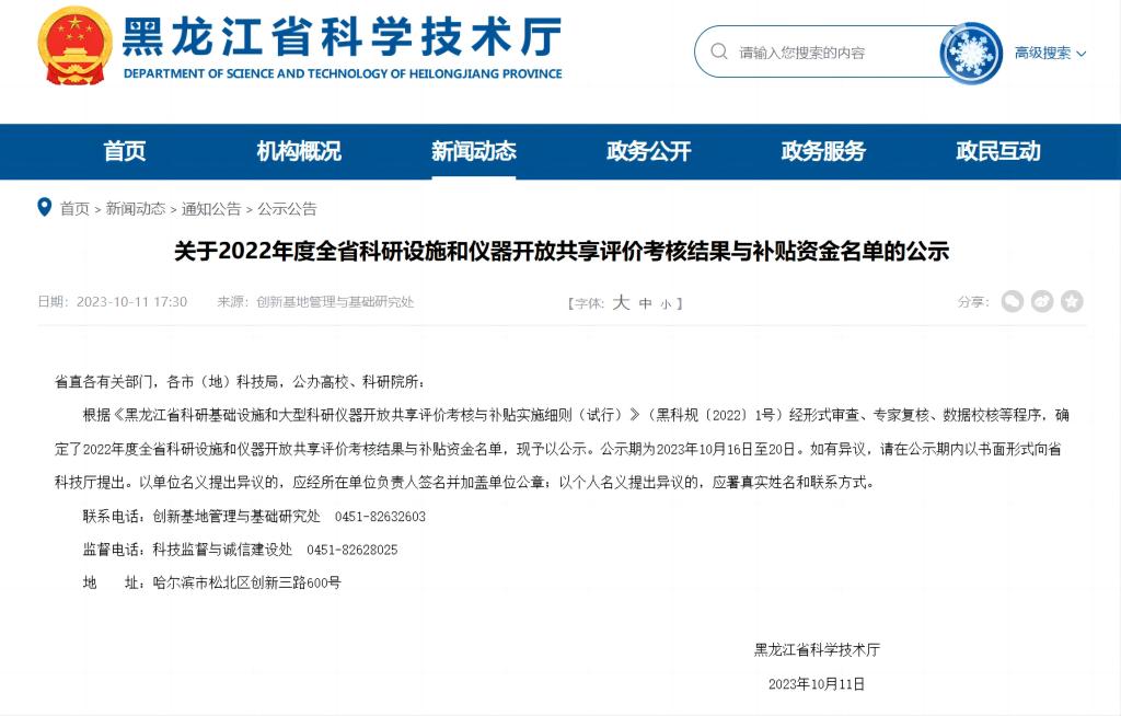近日,黑龙江省科技厅公布了《关于2022年度全省科研设施和仪器开放共享评价考核结果与补贴名单的公示》,我校获得了良好的成绩,这是学校在深入贯彻落实《国务院关于国家重大科研基础设施和大型科研仪器向社会开放的意见》(国发〔2014〕70号),促进科研设施与仪器开放共享,切实提高科技资源配置和使用效率,更好地为教学、科研和社会服务方面取得的又一新成绩。全省科研设施和仪器开放共享评价年度考...