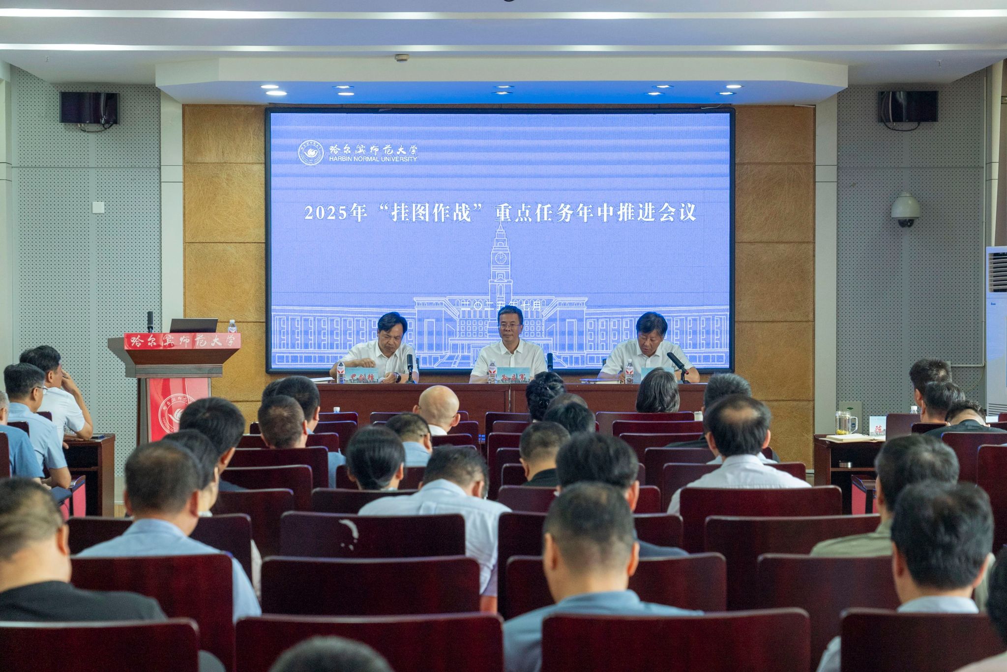 为了更好地推动学校年度“挂图作战”重点任务落地见效,按照学校工作安排,7月3日上午,我校在行知楼746会议室召开2025年“挂图作战”重点任务年中推进会议。党委书记孙立军、校长蒋鲲及学校党政领导班子成员出席会议,全校各职能部门、各教辅单位主要负责人,各学院党政主要负责人参加会议。会议由党委常委、副校长尹剑锋主持。会上,校工会、学生工作部(学生处、武装部)、后勤管理处、西语学院、物理与电子工程学院等5家单位分别就“...