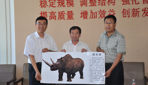 7月12日,青冈县政协主席郑建军、副县长郭英俊、教育局长徐尚海一行三人来我校访问,并向我校展览中心捐赠了于1995年在青冈县境内出土的古生物“披毛犀”化石一具。
