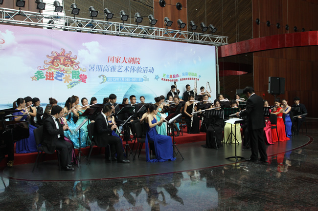 应国家大剧院的邀请,由音乐学院院长陶亚兵带队的我校长笛乐团一行50人于8月22日参加了由国家大剧院主办的“2013暑期高雅艺术体验活动”的演出。