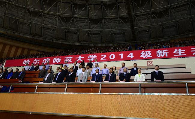 图 开学典礼现场 (盛志伟/文)9月9日上午,我校在江北校区体育馆隆重举办2014级新生开学典礼,校长王选章等党政领导,各学院书记、院长,机关相关部门负责人出席开学典礼。