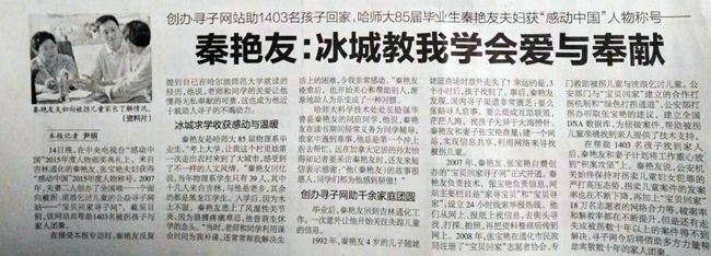 《哈尔滨日报》:创办寻子网站助1403名孩子回家,哈师大85届毕业生秦艳友夫妇获“感动中国”人物称号—— 秦艳友:冰城教我学会爱与奉献 14日晚,在中央电视台“感动中国”2015年度人物颁奖典礼上,来自吉林通化的秦...