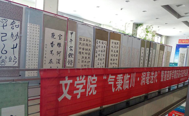 (庄立国/文)为鼓励大学生传承中国传统文化,全面提升学生的文化素养,近日,由文学院团委主办,文学院社团联合会、哈师大书法交流协会联合承办的“气秉临川·润毫迭代”书法作品展在人文楼二楼展出。