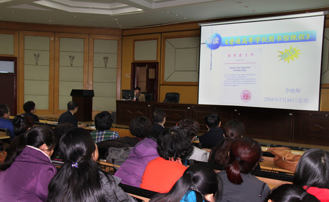 (谢丽茹/文)为了进一步贯彻落实教育部2015年12月31日颁布的《普通高等学校图书馆规程》精神,3月16日下午,图书馆召开了专题报告会,由图书馆学博士、研究馆员李晓辉作专题报告。