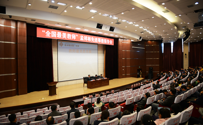 图 报告会现场(盛志伟/文)为进一步宣传和弘扬我校优秀毕业生忠诚教育事业的高尚情怀,不断深化我校师德师风建设,以优良的师风,带动教风,促进学风,推动学校各项事业发展建设,10月9日下午,“全国最美教师”孟祥彬先进事迹报告会在我校江北校区科学会堂隆重举行。学校党政领导,全校副处级以上干部,各民主党派和团体负责人,博士生导师,省重点学科带头人,教师教育学院全体学科教学论教师,江北校区其他学院教师代表,2016年新入职教职工岗前培训班学员,...