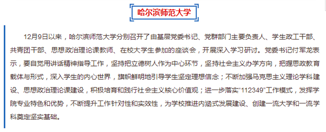 (盛志伟/文)12月15日晚,黑龙江省教育厅官方微信平台以《学习贯彻全国高校思想政治工作会议精神龙江进行时》为题,对我校学习贯彻全国高校思想政治工作会议精神,开展深入学习研讨活动情况进行了报道。