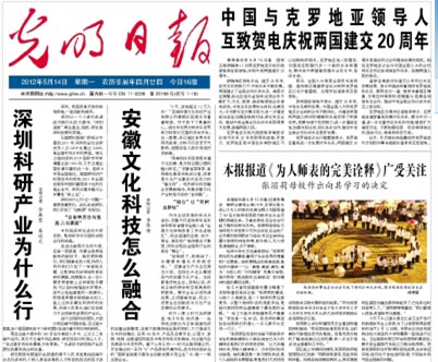 图 《光明日报》5月14日头版 5月13日《光明日报》头版头条以《为人师表的完美诠释》为题报道了80后女教师张丽莉为救学生失去双腿的英雄壮举。