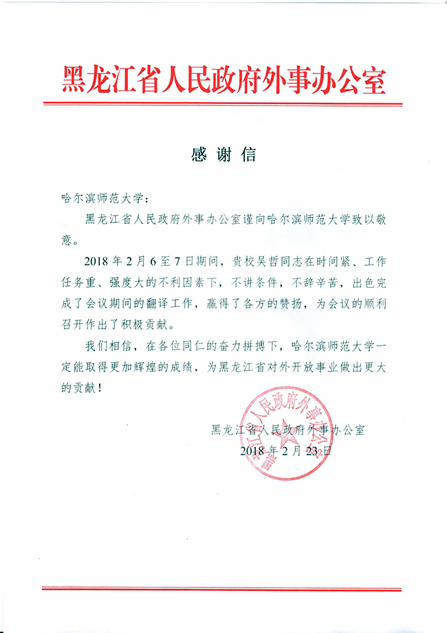 2月6日、7日,斯拉夫语学院吴哲教授受省外事办公室邀请,在中俄地方合作交流年开幕式期间担任口译工作,表现出优秀的从业素质。