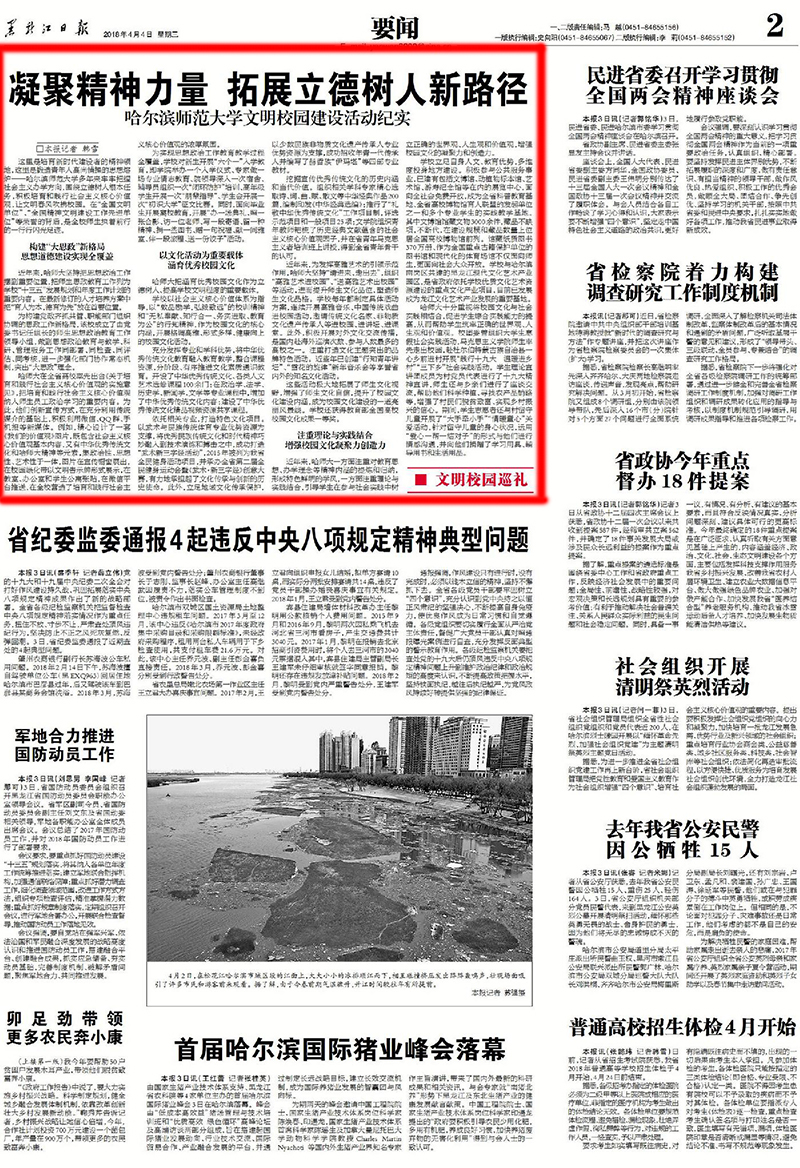4月4日,黑龙江日报二版头题以《凝聚精神力量 拓展立德树人新路径——拼搏在线登录文明校园建设活动纪实》为题,对我校荣获全国文明校园工作进行报道。