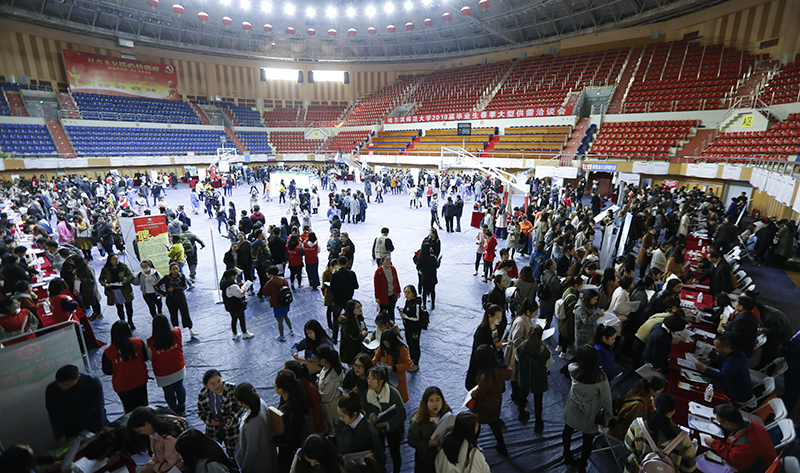 (贺明阳/文)4月15日上午,我校2018届毕业生春季大型供需洽谈会在江北校区体育馆举办。