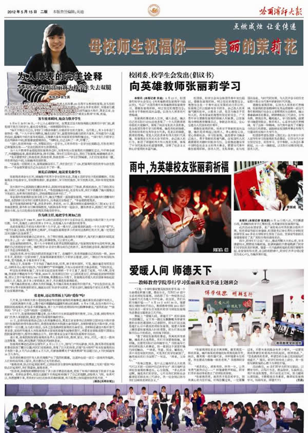 自我校英雄校友、全国优秀教师张丽莉英勇救人的感人事迹发生后,学校党委立即下发了《关于在全校开展向“最美女教师”张丽莉同志学习的决定》,号召全校师生广泛开展向张丽莉同志学习活动。
