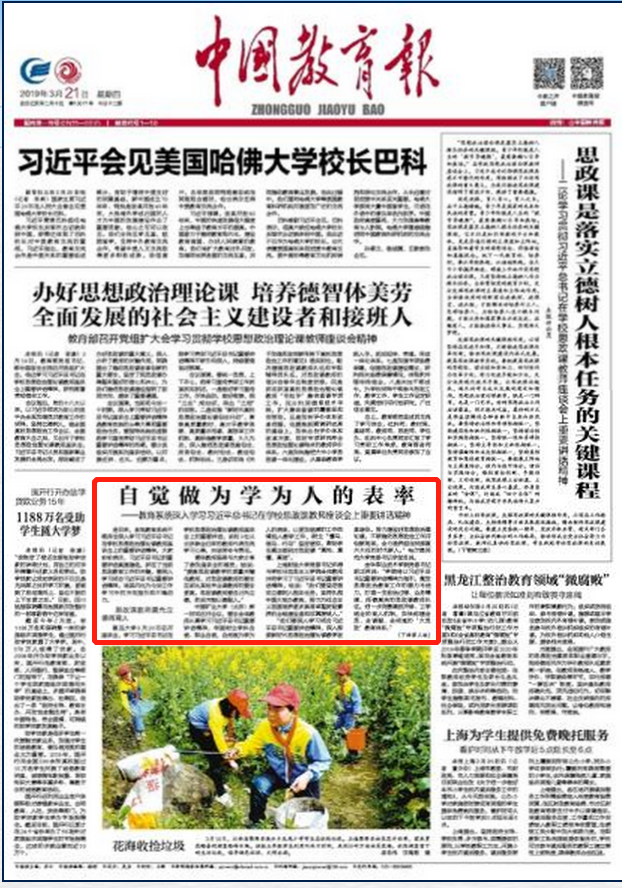中国教育报2019年3月21日头版“自觉做为学为人的表率——教育系统深入学习习近平总书记在学校思政课教师座谈会上重要讲话精神”中刊发了校党委书记的表态发言。