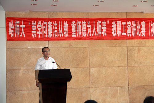 最后,学校党委常委、纪委书记蒋晶洁代表评委对本次比赛做了精彩总结。她说,参赛选手们的精彩表现,充分展示了我校教职员工厚德笃学、为人师表、淡泊名利、甘为人梯的精神风貌和高尚情怀,进一步增强了我们作为哈师大人的自信心和自豪感。要让更多的师生员工参与进来,提高对廉政文化建设的必要性和重要性的认识,大力营造崇廉尚洁的校园廉政文化氛围,确保廉政文化进校园示范点建设工作取得实效,推进我校廉政文化建设向纵深发展。以扎实有效的工作推动我校“四全育人”工程建设和强校建设。