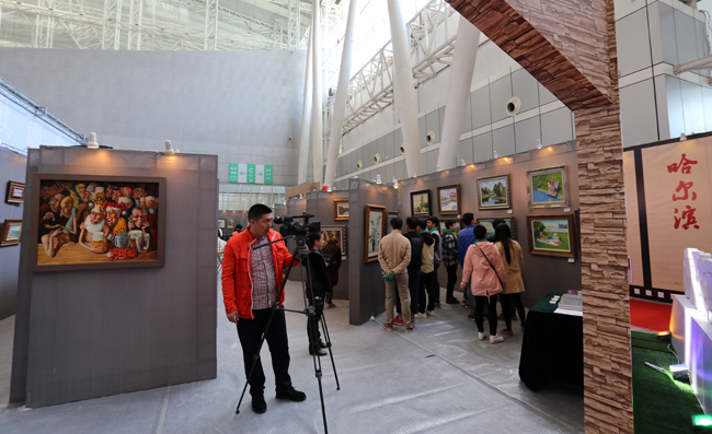 黑龙江省委常委、宣传部长张效廉、副省长孙东生、哈尔滨市委常委、副市长曲磊、省委宣传部副部长赵德信、省文化厅厅长宋宏伟等省市领导在哈师大党委常委、副校长、哈尔滨国际油画交易中心管委会主任李凤飞、哈师大总务长、哈尔滨国际油画交易中心常务副主任马明等领导陪同下来到展厅进行参观,哈尔滨国际油画交易中心刘芳在现场接受了黑龙江省电视台和哈尔滨人民广播电台的采访。