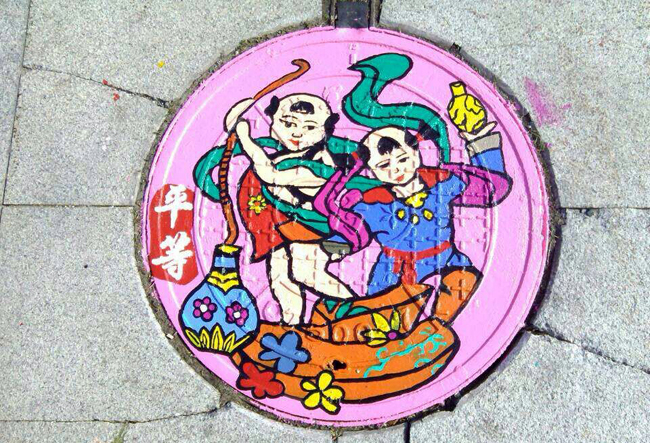 在我校行知楼、图书馆、宿舍楼以及食堂左右两侧人行道上,大部分的井盖都被“化了妆”。红色、黄色、蓝色……缤纷的色彩将原本单调的井盖装扮得靓丽十足。这道独特的师大风景吸引了很多过往的师生。大家都放慢脚步,仔细欣赏,还有不少学生拿出手机拍照留念。路北侧人行道上,一张表现中国传统文化特征的“年画”在井盖上安了家,绘画简单而生动;继续向前走,京剧脸谱跃然井盖上,极富中国风;在路的另一侧,环保主题的井盖绘画随处可见。在行知楼中间是一组社会主义核心价值观主题的井盖绘画,创作者通过图案和文字的巧妙搭配,将青年人对于社会主义核心价值观的理解和诠释形象地表达出来。富强、民主、文明、和谐等具有丰富内涵的彩绘井盖让路过的同学们禁不住驻足观看,热烈讨论。同时,这也从细微之处提醒同学们认真学习贯彻社会主义核心价值观,努力为中国梦的实现贡献青年人自己的力量。