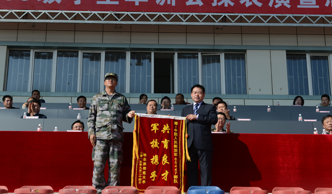 图 党委常委、副校长马明代表学校向承训部队赠送锦旗