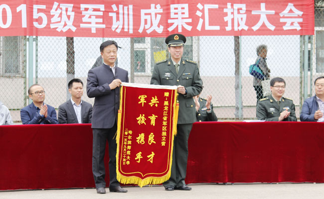 图 党委常委、副校长徐晓风代表学校向承训部队赠送锦旗