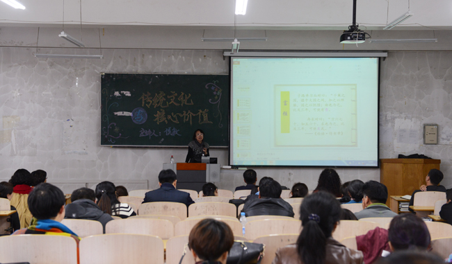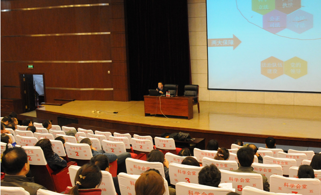 徐德荣作了题为《培育和践行社会主义核心价值观:挑战与使命》的专题报告,着重从道德建设、制度建设、文化熏陶、实践养成等方面,就如何培育和践行社会主义核心价值观作了生动阐释。苗正达从坚守法治精神、法律的特征、运用法治思维和法治方式等角度,就全面推进依法治国,实现依法治校作了深入浅出的讲解。侯敏以《传统文化与核心价值》为题,从传统的儒家、墨家、道家、法家思想出发,简要介绍了传统文化思想、人物及经典,具体阐释了社会主义核心价值观的历史渊源及文化传承。