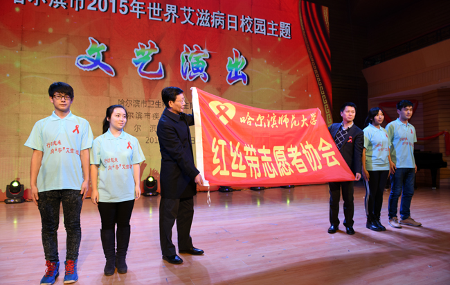 文艺演出中,我校大学生志愿者表演的诗朗诵《相信未来》,歌曲《搭把手》、《追寻》,情景剧《爱的救助》等多种形式,向大学生们宣传普及艾滋病知识,呼吁人们消除对艾滋病人的歧视。活动最后,邢济春为我校“红丝带志愿者协会”授旗,我校团委副书记王洪新代表“红丝带志愿者协会”接受旗帜。