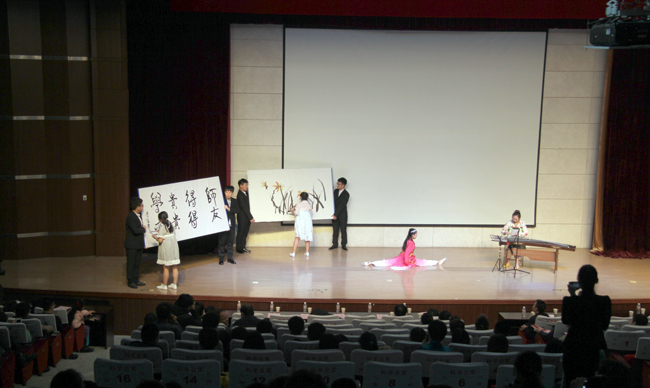 科学会堂流光溢彩,炫舞飞扬,一张张学院活动的照片以视频的形式放映在大屏幕上,见证着学院一年的成长。首先,全体教职工以教研室、办公室为单位,以别开生面的方式和同学们亲切见面。舞蹈《时代花开》拉开演出帷幕,裙摆飘动,舞姿婀娜,迅速点燃全场气氛。关丽君带来爵士舞表演,自由而淳朴的表现把内心的感受用舞蹈表达的淋漓尽致;孟庆裕老师带来的《北国之春》用优美的歌声抒发深情;诗朗诵《祖国,我为你自豪》让全体师生心潮澎湃,作为中华儿女的自豪感油然而生,祖国赞歌唱响整个礼堂;学院党委书记张立君老师带领8位老师表演舞蹈《红豆红》,整齐的步伐,优美的舞姿,活力四射;卢稚林带来的歌曲《你》让学生感受到让人动容的铁骨铮铮;三句半话感恩,笑声不断,现场活跃;徐玲玲老师的女生独唱《加速度》,深受师生喜爱,掌声雷动;孙文军老师的拉丁舞点燃现场气氛;话剧《少年陶行知》生动的讲述行知精神,“生活即教育,社会即学校,教学做合一”,让同学们知晓并不断向行知精神迈步;张伟光老师为我们带来《旅行》,让我们感受旅行带来的自由快乐;浅浅古筝,淡淡墨香,舞一曲惊鸿,古筝书法舞蹈《凤凰于天》以其独特的表演形式营造出浓浓古风;研究生的吉他弹唱,淡雅静谧;T台秀表演《喆•纸间霓裳》赋予T台艺术不一样的韵律,学院的宣传板报变成了美丽霓裳;4名来自新疆的女孩儿为我们带来异域风情;人气爆棚的乐队演出更是掀起全场的兴奋点。