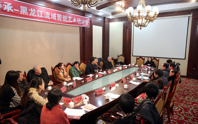 开幕式结束后,我校组织参加开幕式的学者、剪纸艺术家在贵宾楼会议室举办了学术研讨会,研讨会由美术学院副院长孟宪德教授主持。重点讨论了黑龙江流域剪纸艺术如何传承与保护以及高校在非物质文化遗产传承与保护中如何发挥作用。与会的专家学者、剪纸艺术家、代表性传承人纷纷发表了个人想法和建设性意见。