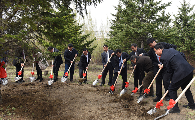 图 领导、嘉宾和校友代表共同为主题树培土,为校友园项目奠基