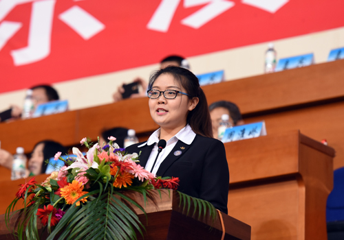图 在校学生代表、校学生会主席周淮娇同学在会上发言