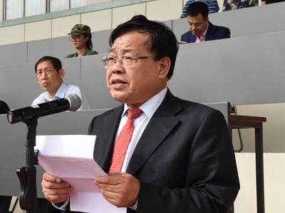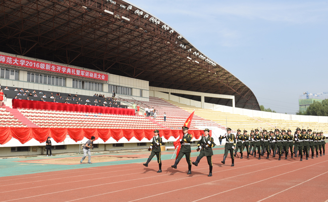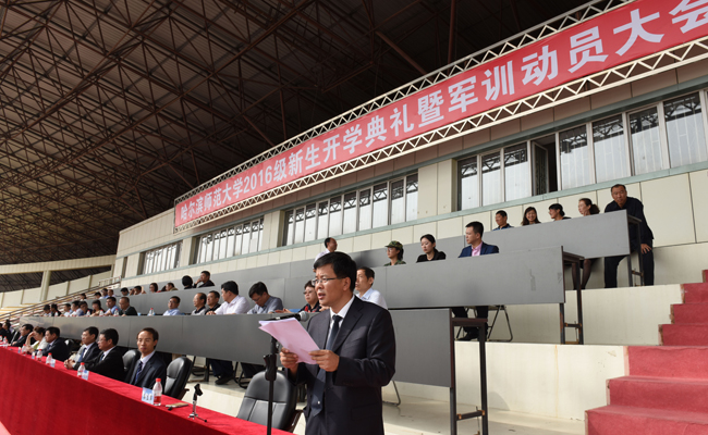 孙立军在典礼上讲话。 孙立军指出,2016级新同学们的到来,为美丽的师大校园注入了全新的生机与活力,为我们深爱的学校注入新的力量与希望。未来的四年,将是同学们人生道路上砥砺品格、磨练意志的重要四年;将是同学们刻苦学习、奋发图强的黄金四年;也将是同学们自我完善、厚积薄发的关键四年。希望同学们要珍惜大学四年这短暂而宝贵的大好时光,尽快适应大学生活、完成角色转换,奋发向上、刻苦钻研、不断超越自我,努力成为一名无愧于父母、无愧于祖国和时代的栋梁之才。
