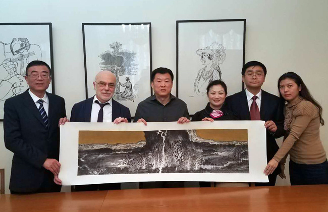 为表达我校对莫斯科苏里科夫美术学院的感谢,何晶代表学校向柳巴温院长赠送了由著名青年画家、我校美术学院副院长李岗的画作。