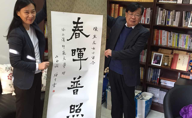 图 王选章校长代表学校向陈春花老师赠送书法“春晖普照”