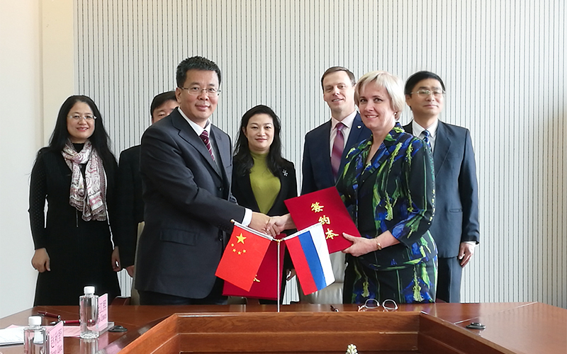 图 我校校长孙立军与俄罗斯布拉戈维申斯克国立师范大学校长维·维·肖金娜签署友好合作协议