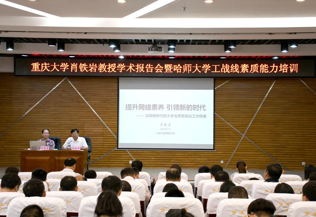 (仲微微/文)7月5日上午,我校邀请重庆大学研究员、博士研究生导师、重庆大学马克思主义学院院长肖铁岩教授为我校师生作了题为“新时代下大学生网络思想政治教育如何有效开展”的学术报告,对我校学工战线工作人员进行素质能力培训。党委常委、副校长杨锐锋主持会议。党委宣传部、学生工作部(学生处)、团委、教育部高校辅导员培训和研修基地全体人员,马克思主义学院师生代表、各学院党委副书记、全体辅导员聆听了报告。