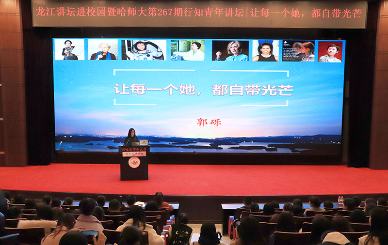 郭砾通过一手的调查研究资料,通过诺贝尔奖获得者屠呦呦、2018年国家技术发明一等奖获得者苏东林、全国妇联刚刚授予的10位全国三八红旗手标兵中的创新肿瘤精准治疗研究并实现成果转化的中国科学院院士阎锡蕴、破解多项常规兵器试验鉴定难题的陆军某基地高级工程师吴颖霞等优秀女性以及女企业家董明珠、美国联邦最高法院85岁女性大法官金斯伯格的故事,鼓励女大学生都能在人生中找到独一无二的自己与独一无二的道路,“你身上藏着的力量,远远比你想象中更强”。郭砾号召作为哈师大的女领导、女教授、女导师要有意识地培养女生的学术自信心,鼓励她们在学术研究方面积极进取,每一位老师都要把自己作为哈师大女生的榜样,男性也要做性别平等的有力参与者与推动者。