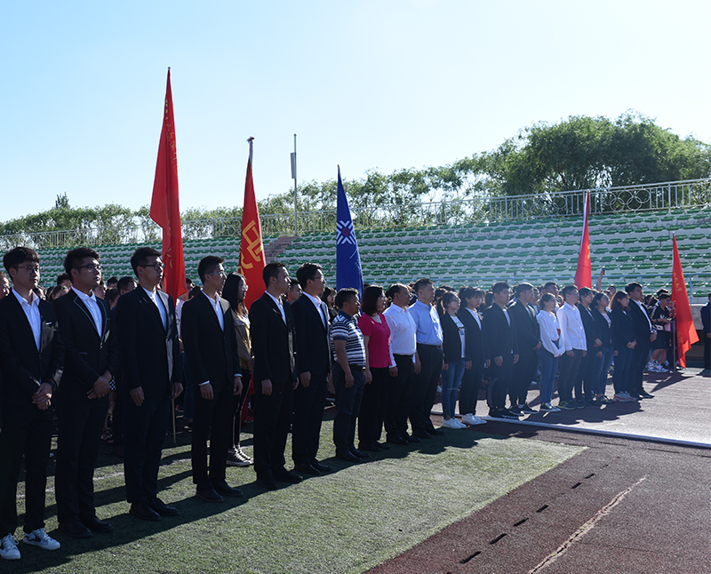 伴随着激昂的分列式进行曲,升旗仪式正式开始。国旗护卫队的队员们迈着整齐的步伐护送国旗入场。在雄壮的国歌声中,在全体师生的注目下,五星红旗冉冉升起,迎风飘扬。活动上,郭砾为毕业生党员代表佩戴党徽,姜玉洪为毕业生代表佩戴校徽。