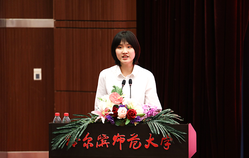 学生代表、传媒学院2017级王晗代表全体学生发言,祝全校教师节日快乐。她表示,感恩在我们人生最美的阶段与老师相遇,教诲我们慎思明辨努力向前。年轻的我们有着绚丽多彩的梦想,一定志存高远,脚踏实地,刻苦学习,牢记使命。用自己的努力践行青春的精彩,用热情与拼搏同敬爱的老师们一起续写哈师大人的辉煌。