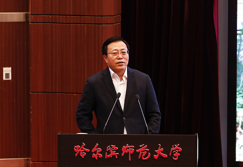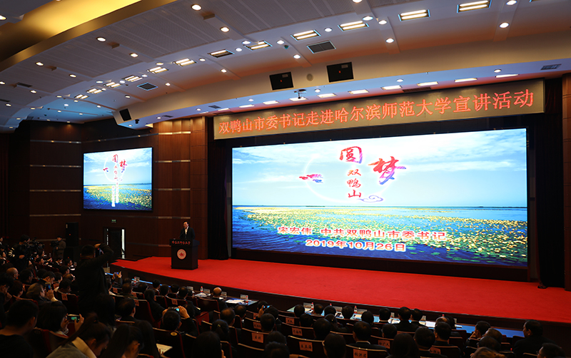 党委书记在致辞中指出,市委书记走进高校宣讲是省委作出的一项重要决策部署,对于深化高校与地方交流合作、推进创新驱动发展战略实施、培养高素质人才、实现校地校企共赢具有重要意义。我校作为黑龙江省高等师范教育的领头羊,多年来为地方输送了大批人才,推进了地方经济社会全面发展和学校办学水平的整体提升。学校始终注重围绕地方经济建设,服务地方社会经济发展,加强科技成果转化应用,并在事业发展中与双鸭山市结下了深厚的情谊。我校与双鸭山地区的实习基地学校合作良好,双鸭山市区、饶河县、集贤县、友谊县、宝清县都是我校优质实习基地,现有实习基地8个,四年来接收我校实习生共计374人。哈师大双鸭山市校友会于2010年成立,目前在双鸭山的在册校友4000余人,分别在政府、企事业单位、学校教育中做出了杰出贡献,其中双鸭山地区有11所中学的校长和百余名教学骨干都是哈师大的优秀毕业生。学校现有双鸭山籍在校学生669人,分布在71个学科专业。近三年来,哈师大有300余名毕业生到双鸭山工作创业,其中双鸭山籍的考生回乡创业的有115人。