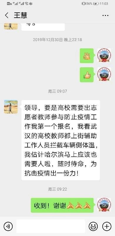 疫情防控是一场大战,也是一次大考。疫情防控期间,学工战线同志都放假在家,疫情就是命令,每名同志都能召之即来,用自己的行动践行党员的初心和使命。学生管理科李井申,春节前陪家人回佳木斯老家过年,疫情发生后,正月初六毅然告别父母和双胞胎儿子返回哈尔滨,担负起信息发布、全校学生数据排查、统计、上报,确保全校信息及时准确。美术学院辅导员王慧主动请缨,“如果学校要组织党员先锋队参与学校和哈市的疫情防控工作,她第一个报名,随时待命,为打好疫情防控阻击战贡献出自己的一份力量”。体育科学学院辅导员孙燕弛说:她深刻懂得聚沙成塔的道理,千千万万个普通的我们就能凝聚成强大的中华民族,希望能用自己的微薄力量,影响自己的学生和身边更多人做一些正能量的事,她号召160多名学生、同学和朋友,为疫情筹集善款4万余元,购买了3万元钱口罩支援武汉疫区,购买1万多元钱鲜奶慰问我省防疫一线医生。