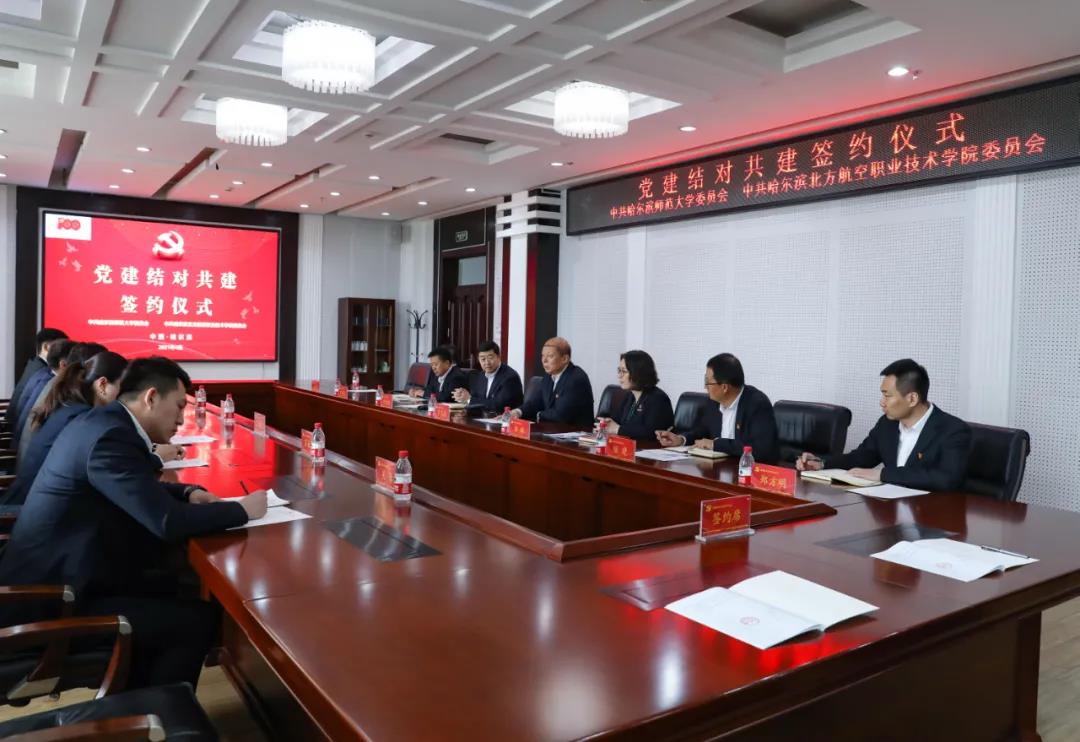 (胡译平/文)为贯彻落实省委教育工委关于黑龙江省公办高校与民办高校党建结对共建的工作要求,切实提高基层党建工作水平,促进党建质量不断提升,4月23日下午,我校与哈尔滨北方航空职业技术学院党建结对共建签约仪式在行知楼915会议室举行。校党委书记,党委副书记、工会主席郭砾,党委常委、组织部长李世彬,哈尔滨北方航空职业技术学院党委书记夏尊民,党委副书记、组织部长陈会刚等领导,以及两校相关部门同志出席签约仪式。签约仪式由郭砾主持。