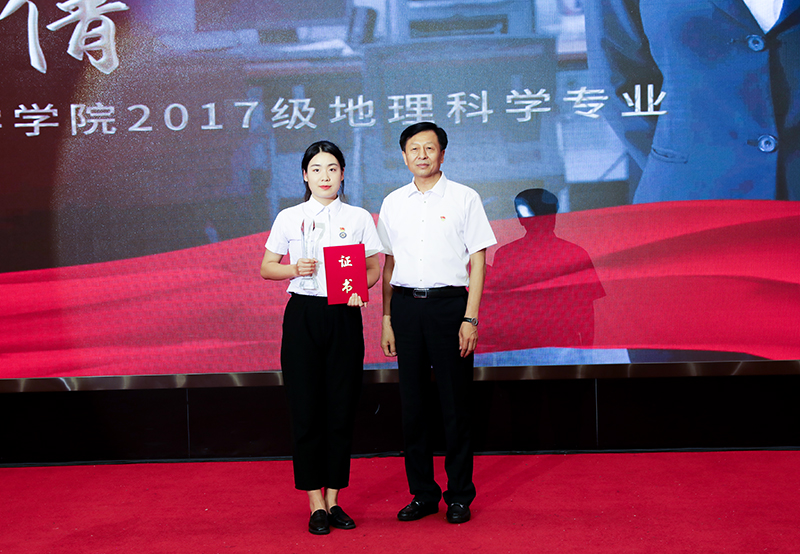 图 党委常委、组织部长李世彬为感动校园十佳大学生个人颁发获奖证书和奖杯