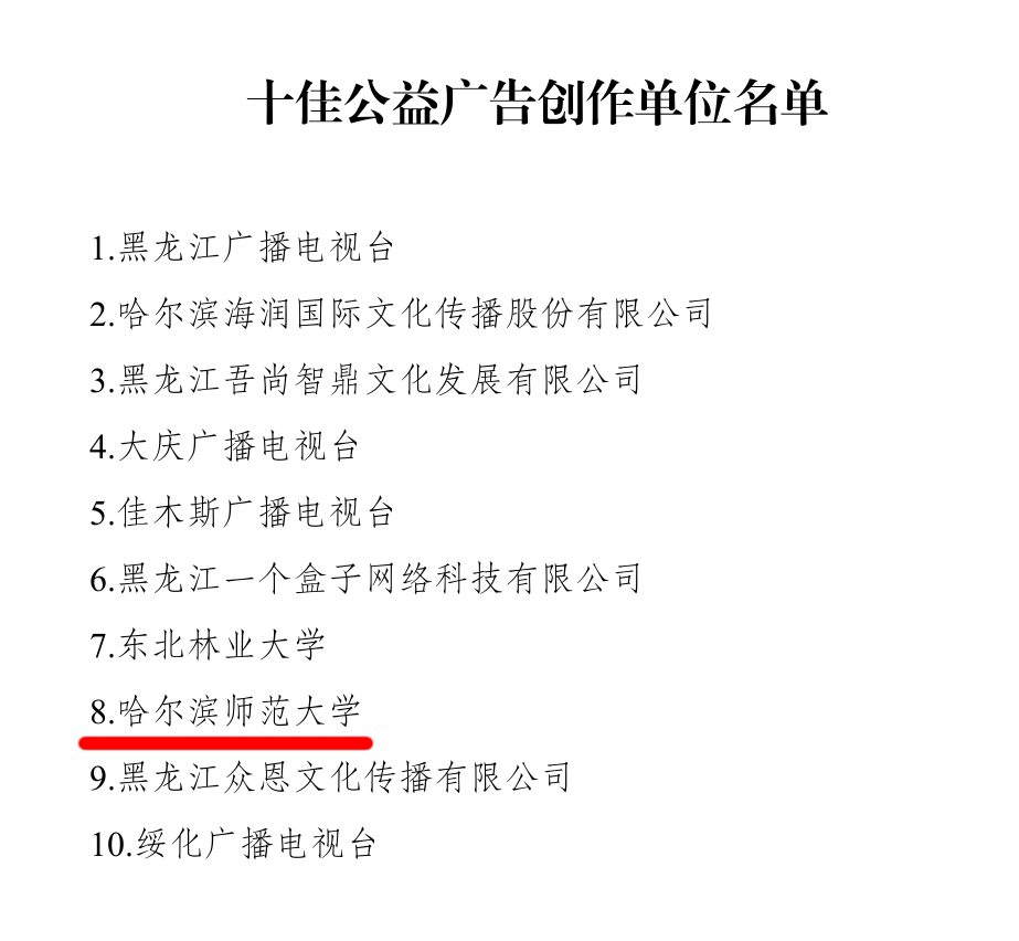 经过专家评审,我校美术学院高福双作品《龙江四大精神》获平面广告类金奖,传媒学院高歌作品《脱贫跟党走系列海报》获平面广告类铜奖,传媒学院白雪岩、刘硕作品《我和我的祖国》和传媒学院高歌作品《共抗疫情系列》获平面广告类优秀奖;传媒学院刘育辰、贺渤懿、董宗泽、王智慧作品《星火》获电视广告类金奖,传媒学院于海礁、董宗泽、卢德宇、李昕鹏、刘建康、江苹苹、曾雨桐、张茂、张新阳作品《敬业奉献砥砺前行》和传媒学院于海礁、郭航、刘欣作品《青春正当时奋力不止步》获电视广告类铜奖。我校获“优秀组织奖”、“十佳公益广告创作单位”。